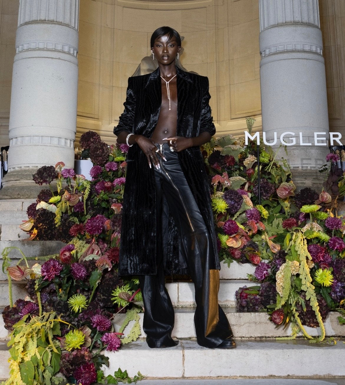 Anok Yai in Sanda Simona leather pants during Paris Fashion Week
